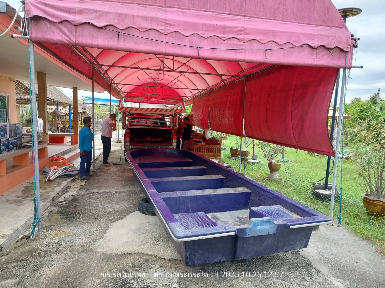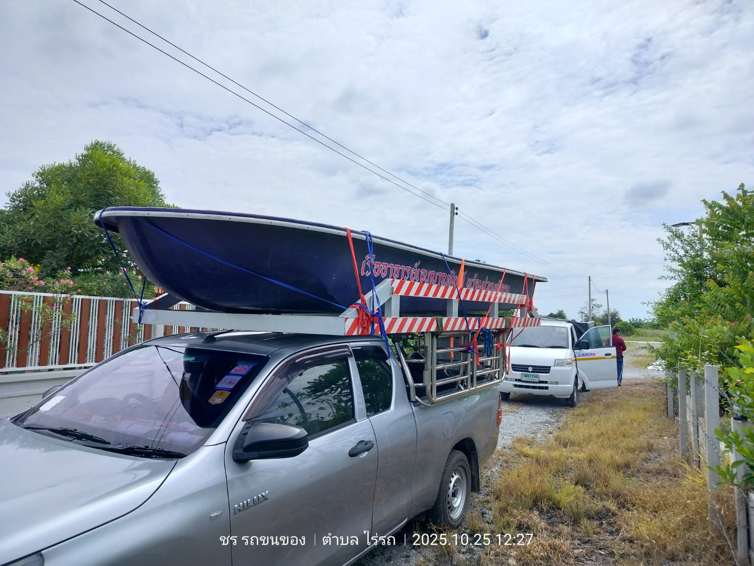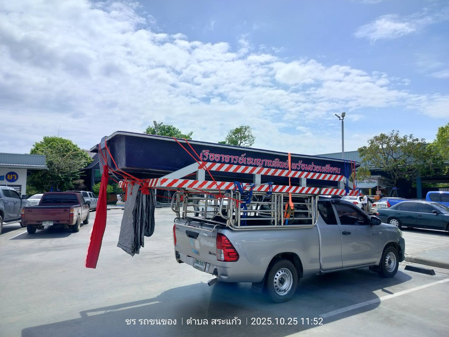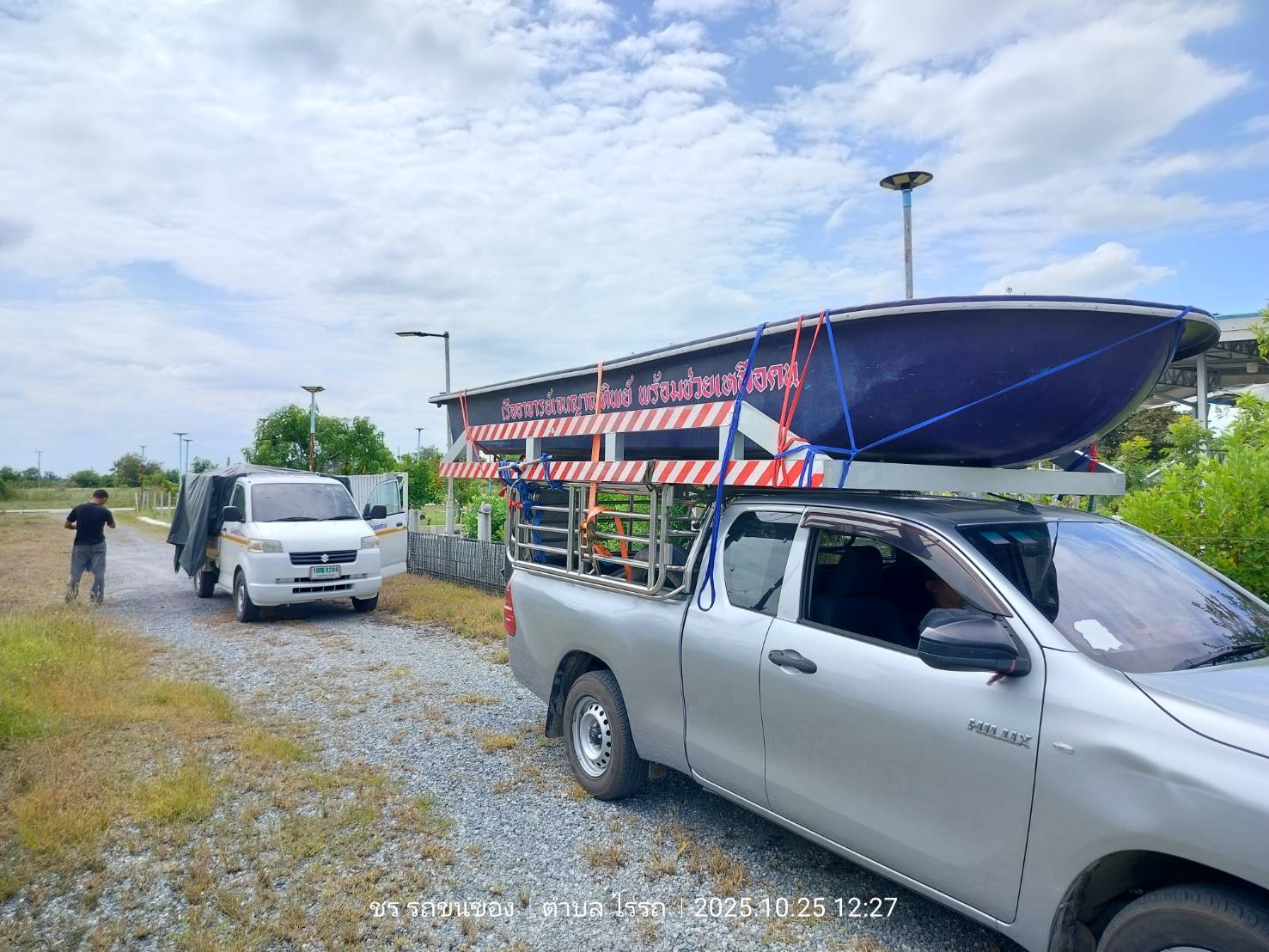 ทีมงานเราไป4คน รถ2คัน ขนส่งเรือกู้ภัยขนาดใหญ่ กว้าง1.80เมตร ยาว5.80เมตร และอุปกรณ์ของใช้เพื่องานทำบุญอื่นๆ ขนจาก ถนนวิภาวดี ดอนเมือง กทม. ขนไป สระกระโจม ดอนเจดีย์ สุพรรณบุรี