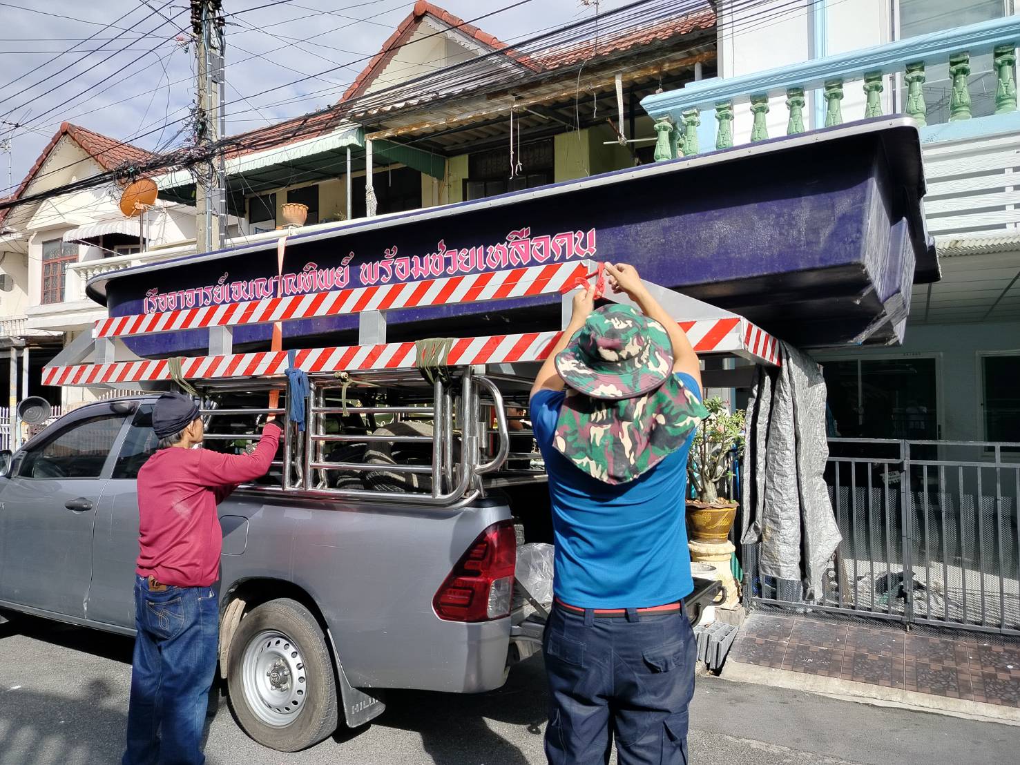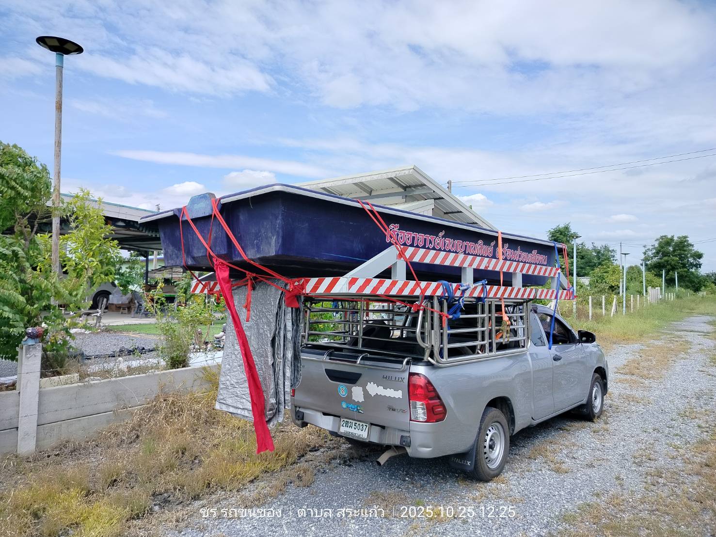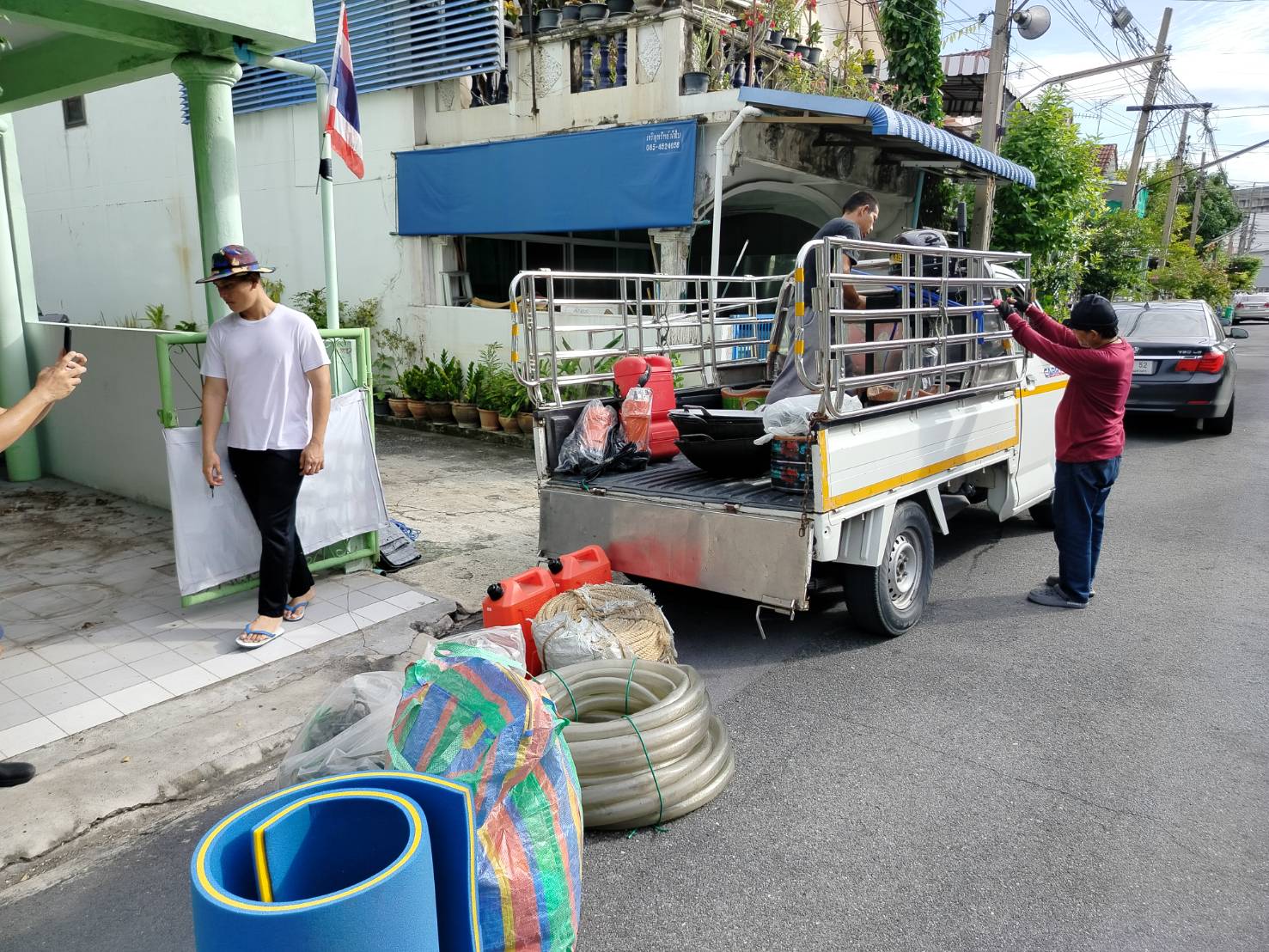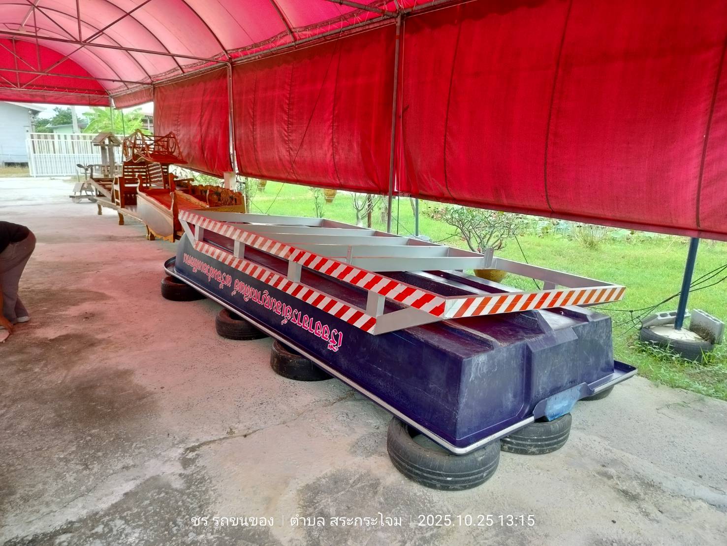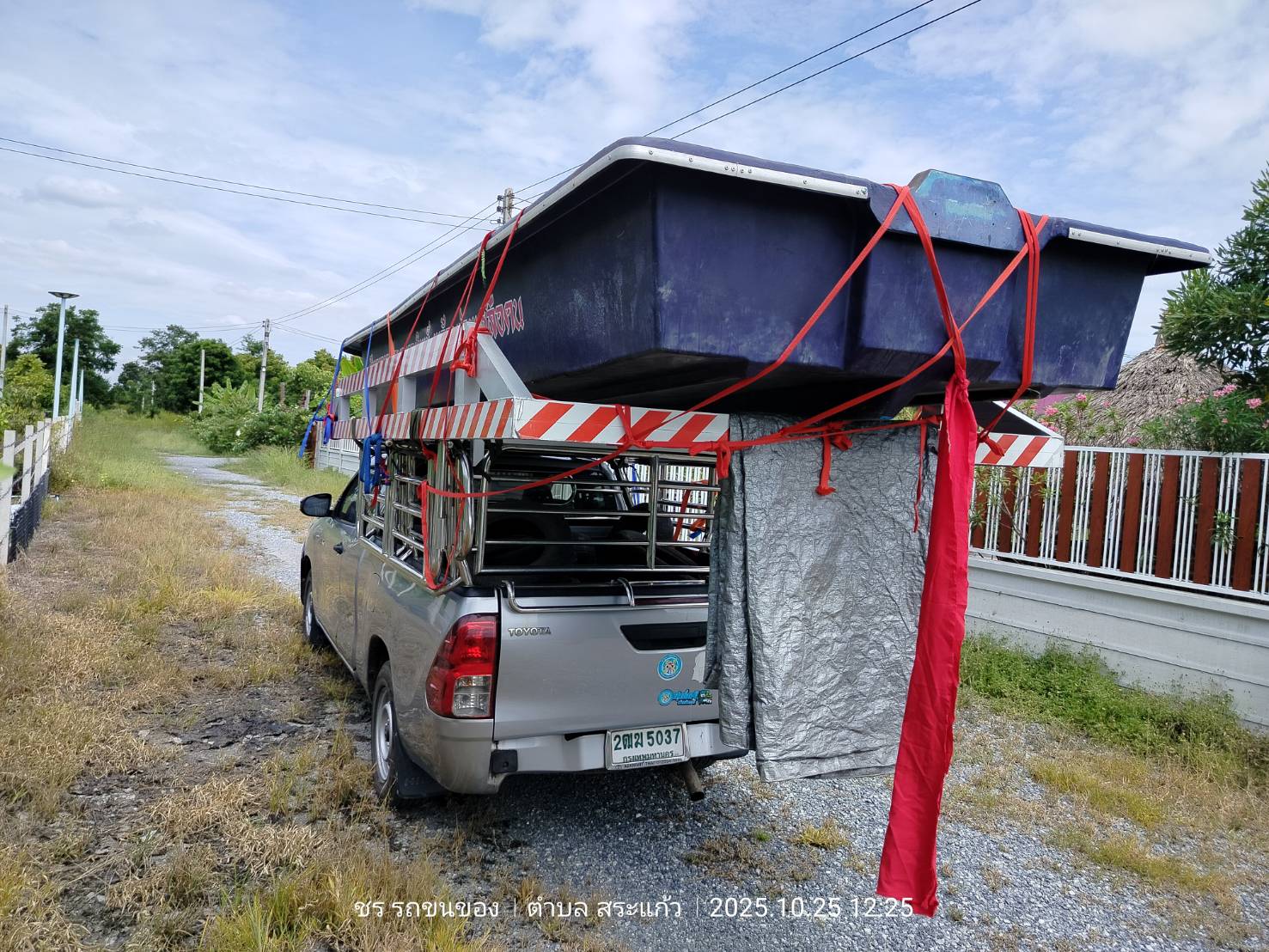 ทีมงานเราไป4คน รถ2คัน ขนส่งเรือกู้ภัยขนาดใหญ่ กว้าง1.80เมตร ยาว5.80เมตร และอุปกรณ์ของใช้เพื่องานทำบุญอื่นๆ ขนจาก ถนนวิภาวดี ดอนเมือง กทม. ขนไป สระกระโจม ดอนเจดีย์ สุพรรณบุรี