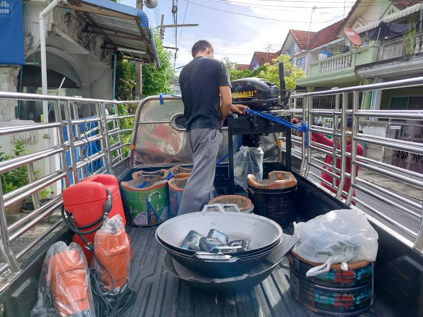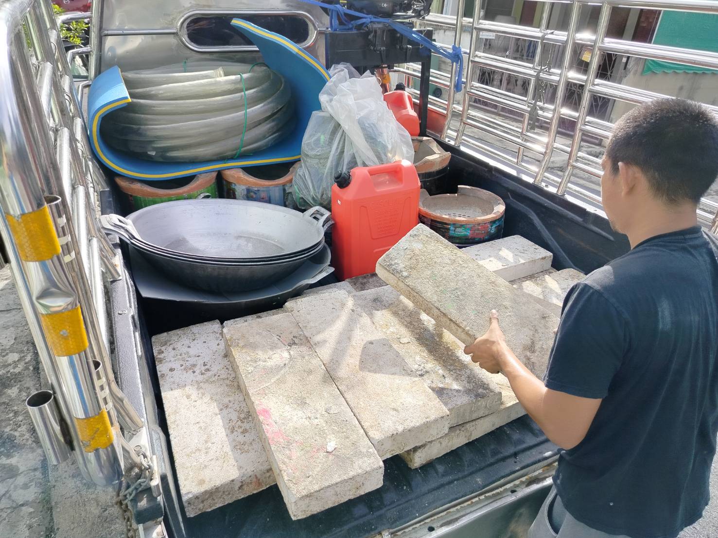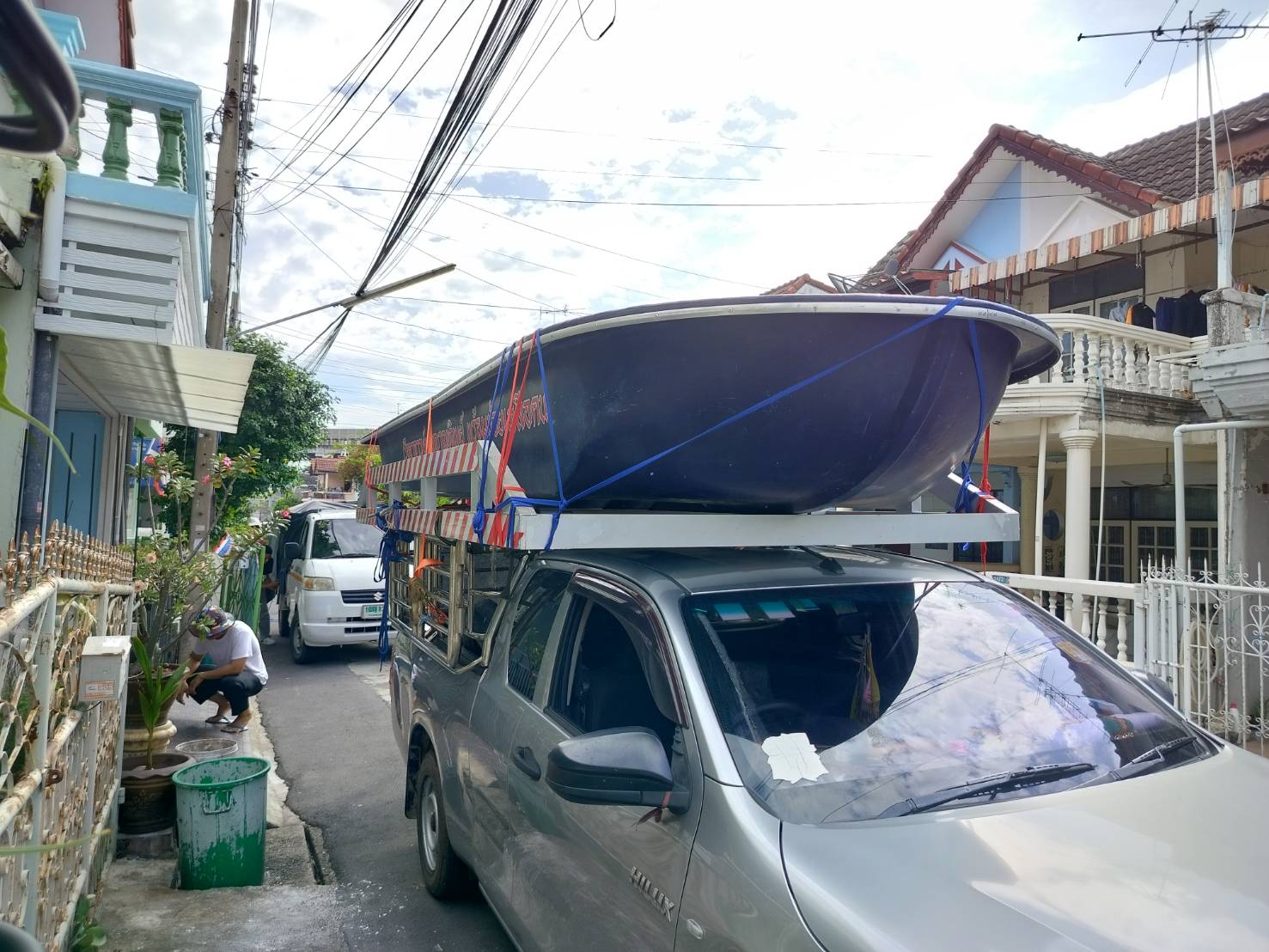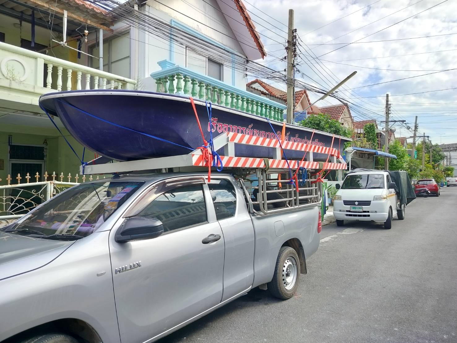 ทีมงานเราไป4คน รถ2คัน ขนส่งเรือกู้ภัยขนาดใหญ่ กว้าง1.80เมตร ยาว5.80เมตร และอุปกรณ์ของใช้เพื่องานทำบุญอื่นๆ ขนจาก ถนนวิภาวดี ดอนเมือง กทม. ขนไป สระกระโจม ดอนเจดีย์ สุพรรณบุรี
