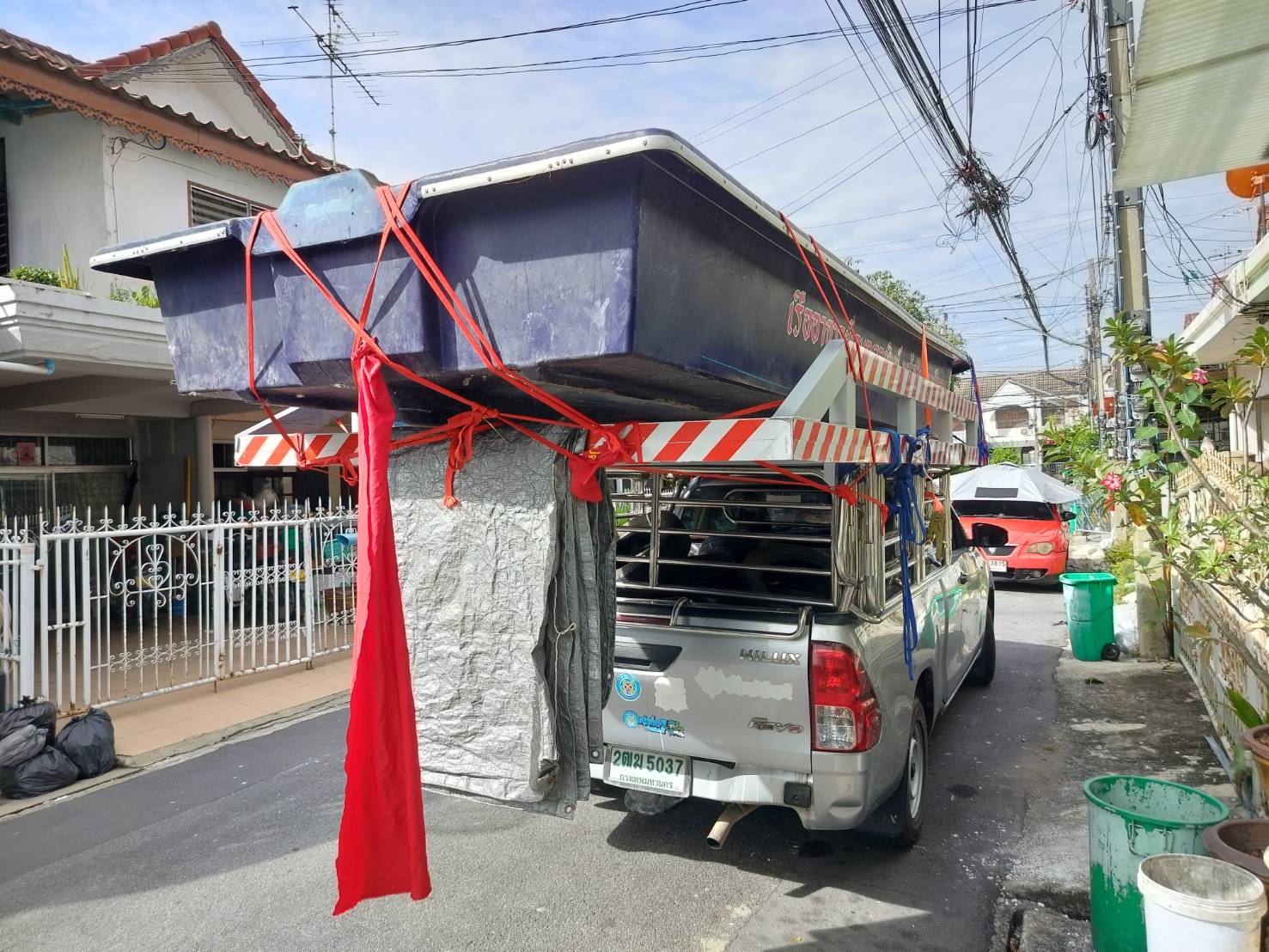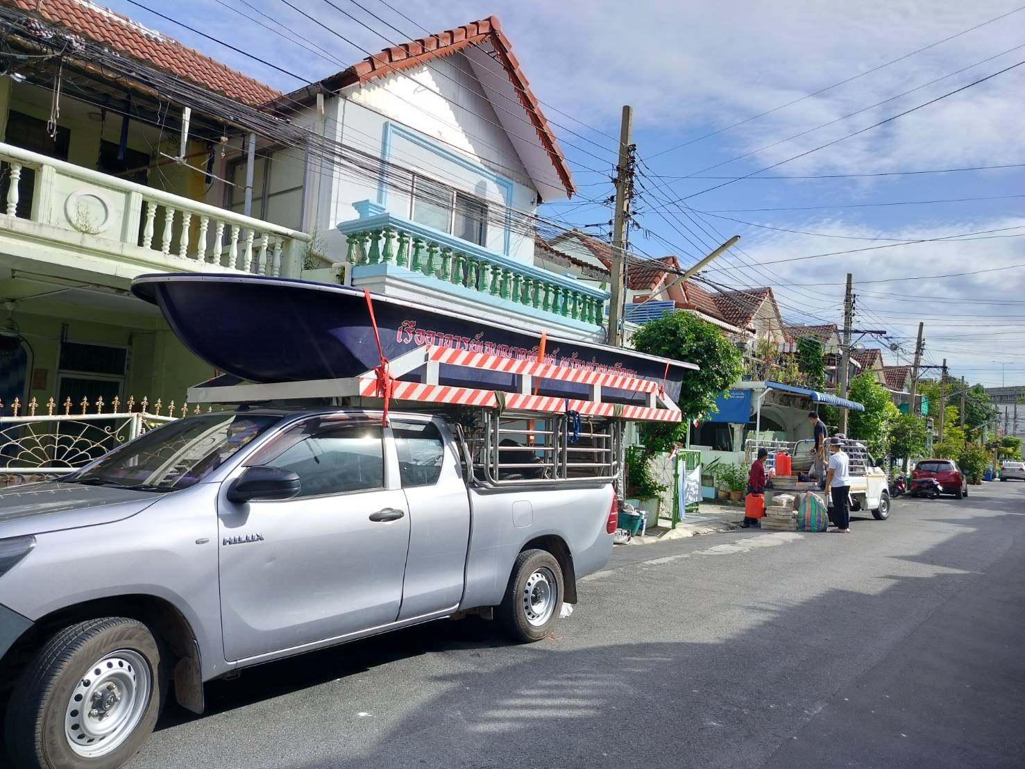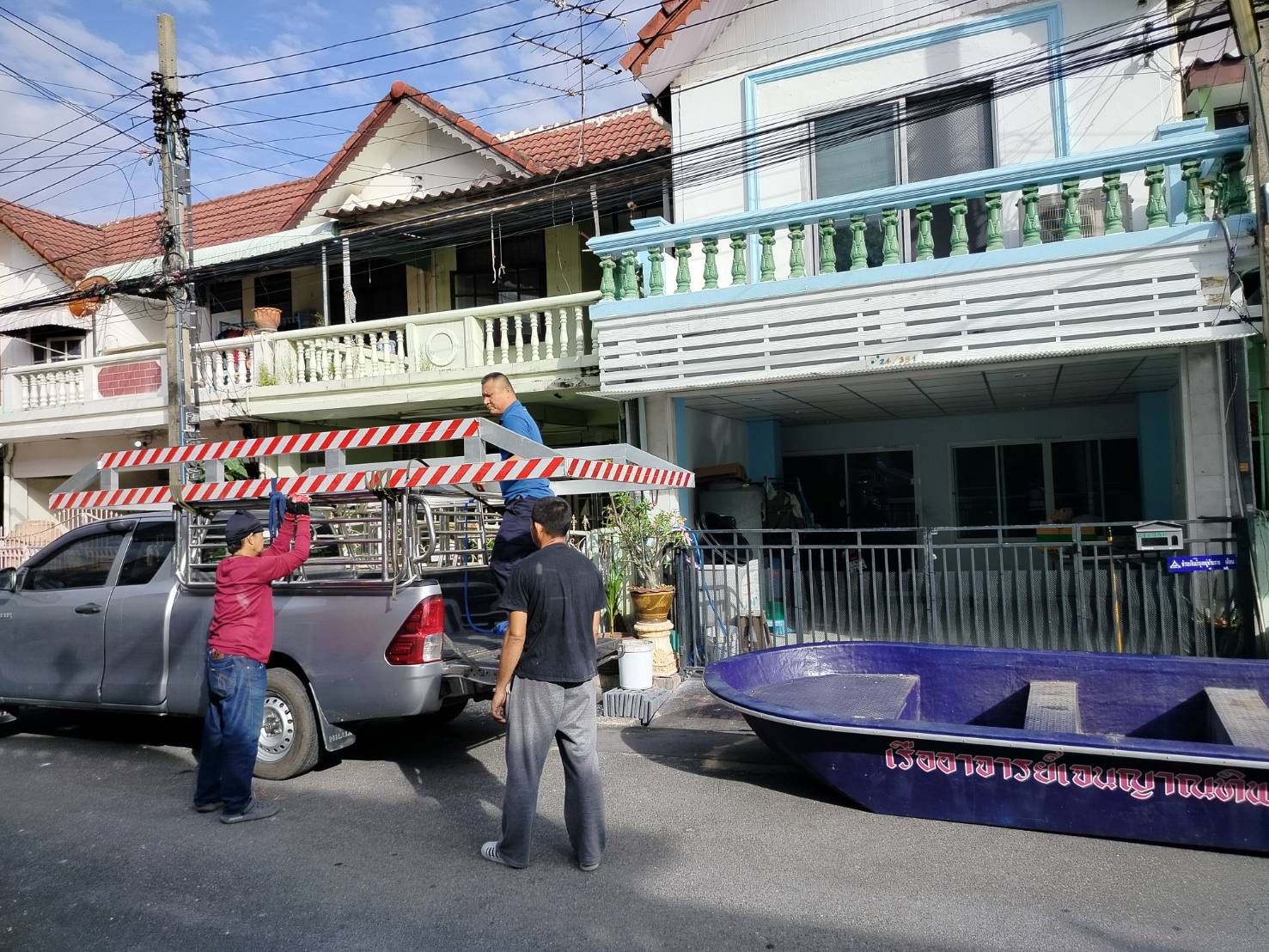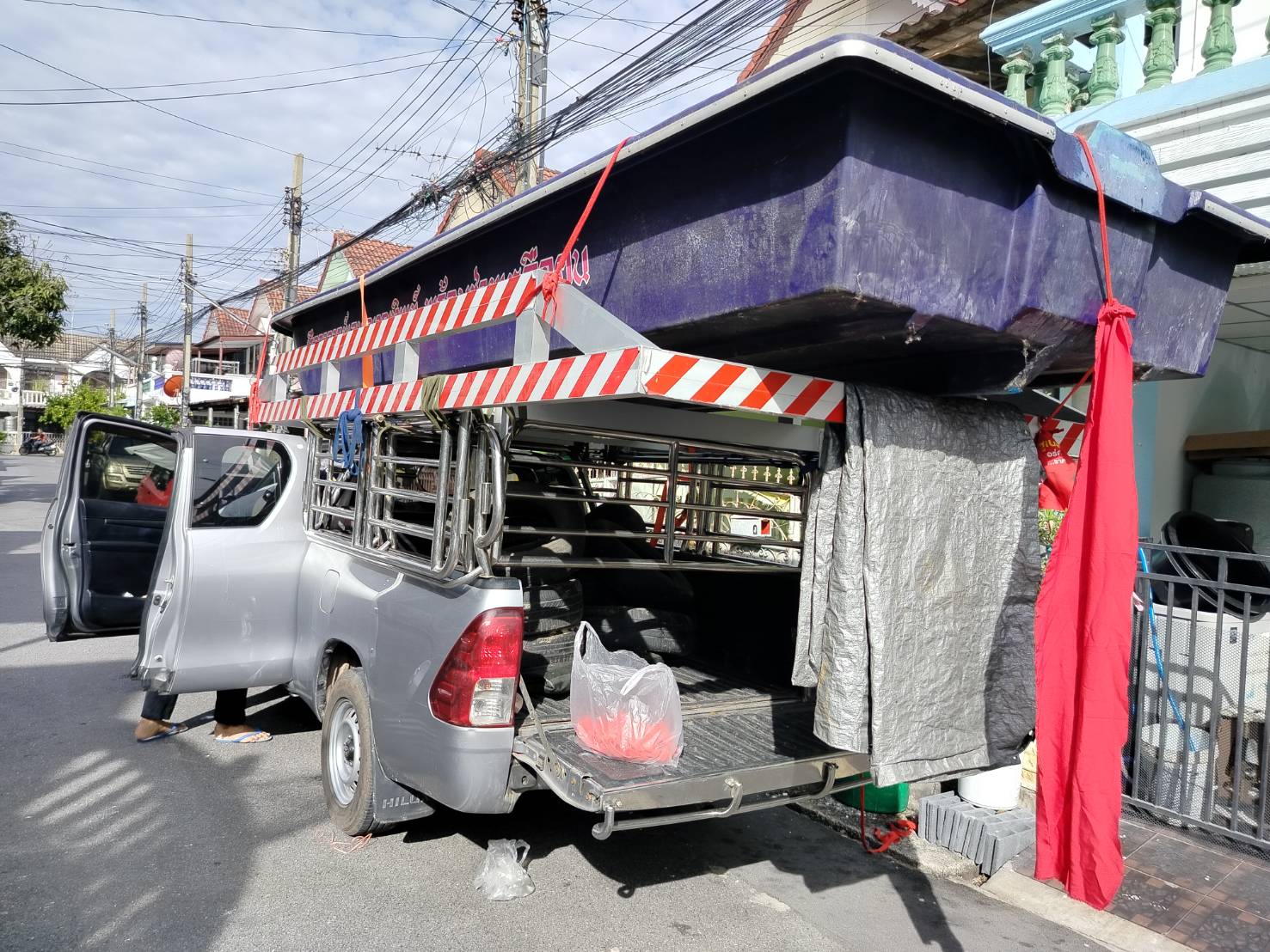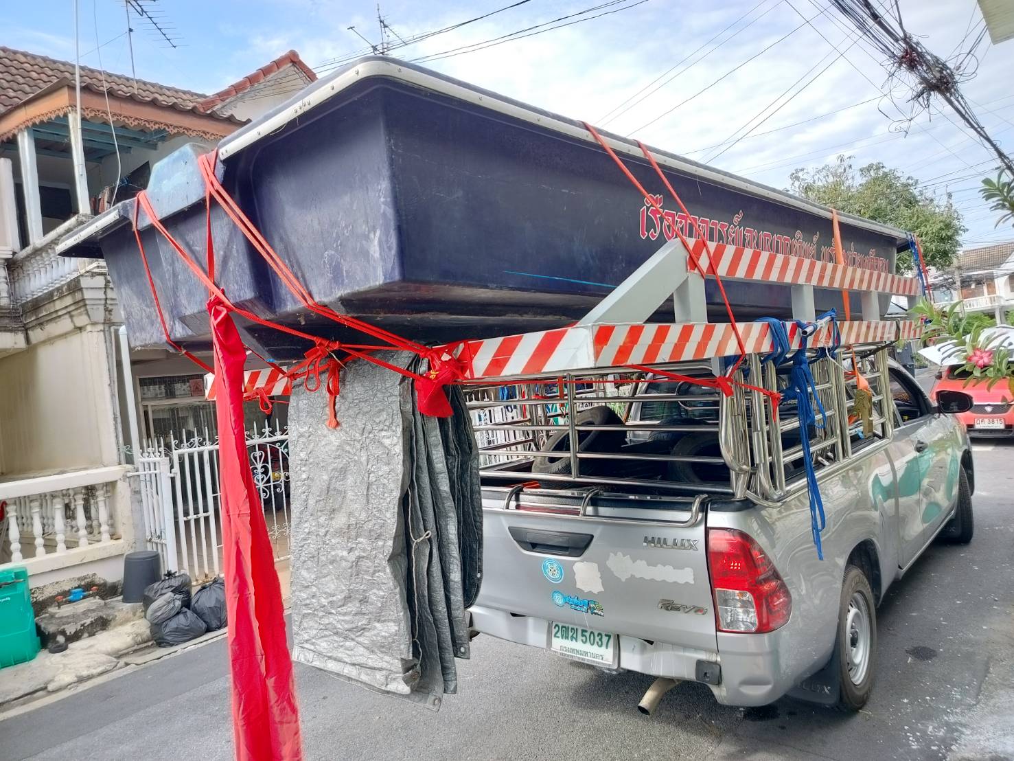 ทีมงานเราไป4คน รถ2คัน ขนส่งเรือกู้ภัยขนาดใหญ่ กว้าง1.80เมตร ยาว5.80เมตร และอุปกรณ์ของใช้เพื่องานทำบุญอื่นๆ ขนจาก ถนนวิภาวดี ดอนเมือง กทม. ขนไป สระกระโจม ดอนเจดีย์ สุพรรณบุรี